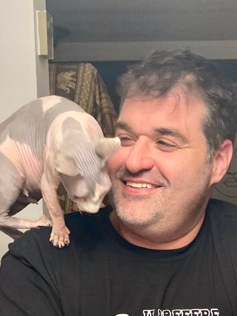 Les Sphynx aiment les hauteurs! Rosie sur les épaules à Martin.